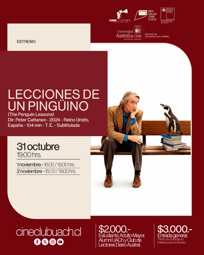 La película, de 104 minutos de duración y calificada para todo espectador, se exhibirá desde el viernes 31 de octubre, a las 19:00 horas. Las siguientes funciones se realizarán el sábado 1 y domingo 2 de noviembre, a las 16:00 y 19:00 horas. El valor de la entrada general es de $3.000 y $2.000 para estudiantes, adultos mayores, Alumni UACh y socios del Club de Lectores del Diario Austral. Los tickets estarán disponibles en la boletería de la sala desde una hora antes de cada función, solo en efectivo.